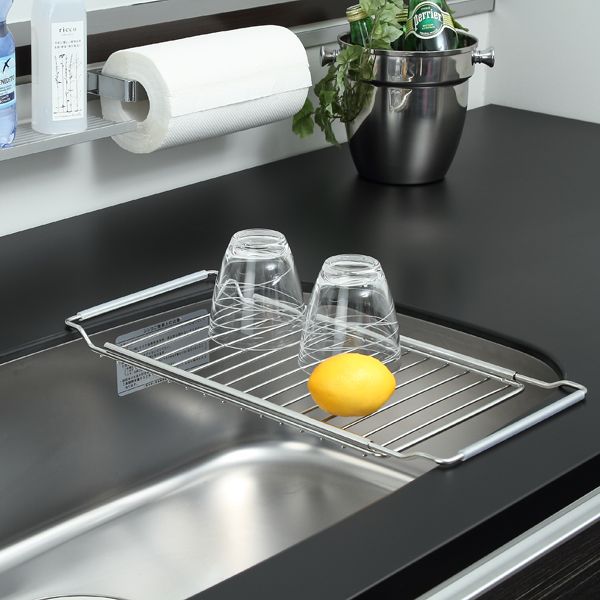 仕切りがないので、シンク上でのまな板の渡しとして使ったりコップや野菜の水切りとして活躍する水切りラックです。伸縮式になっており、60cm以内のシンクでお使いいただけます