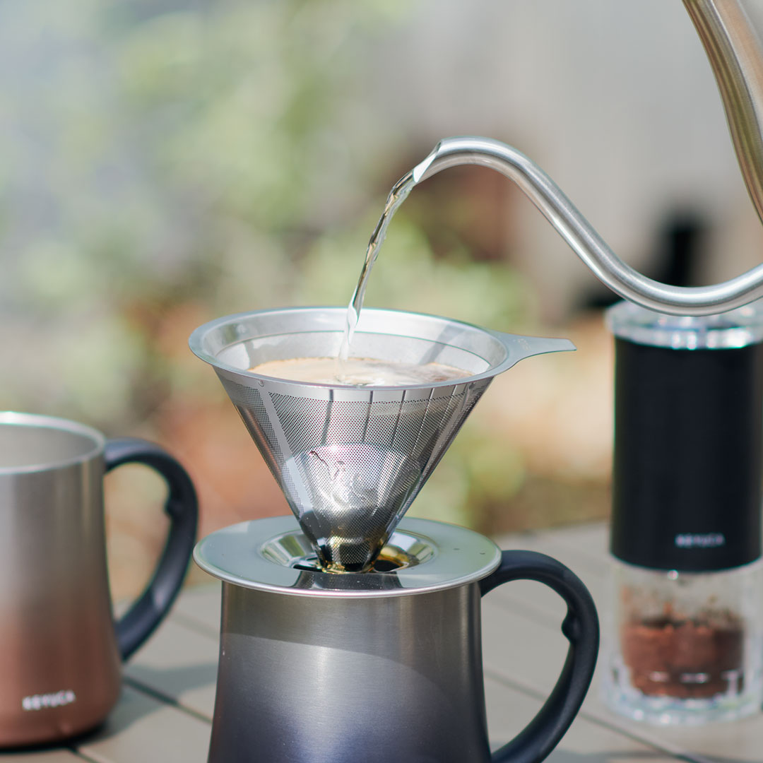 スタイリッシュなステンレス製の1〜2人用のコーヒードリッパーです。2層構造で豆を抽出し、紙のフィルターが不要なのでエコです。