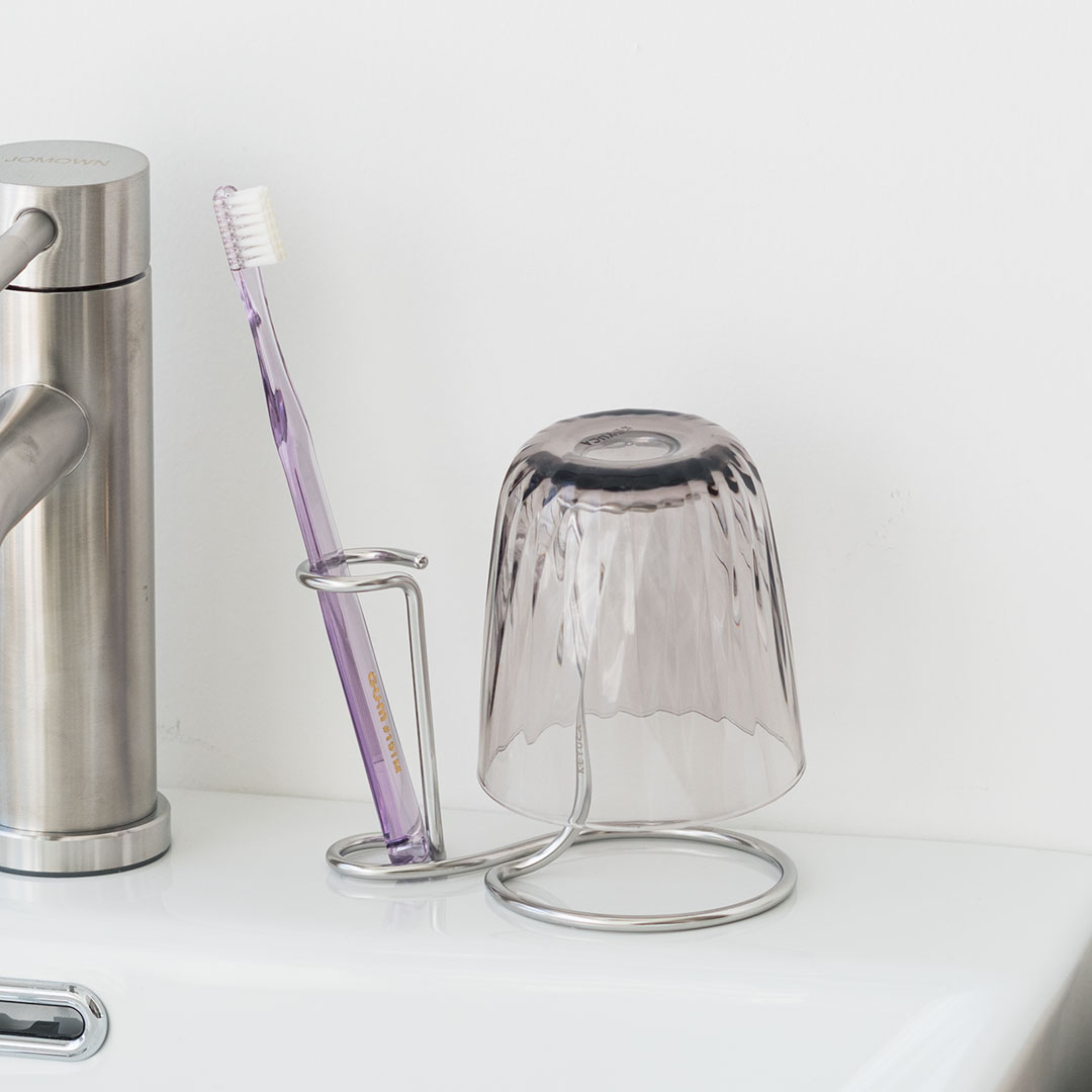 ハブラシ用コップを逆さにして収納できますので、非常に水切れが良く、とても衛生的です。1本のステンレス線材を曲げてシンプルに形作っているため、汚れにくく洗いやすいので、お手入れも簡単。吸盤をくっつけるなど、設置の手間も入りません。