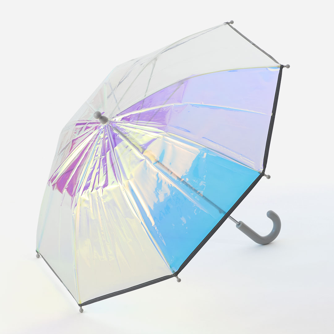 キラキラと虹色に輝く、ビニールタイプのキッズ長傘です。見る角度によって色の変化が楽しめます。