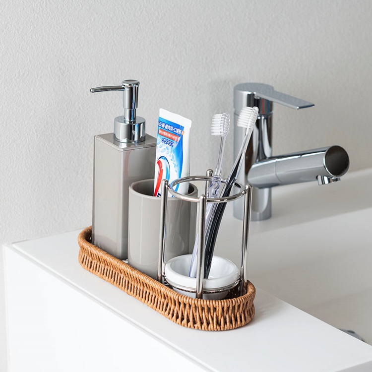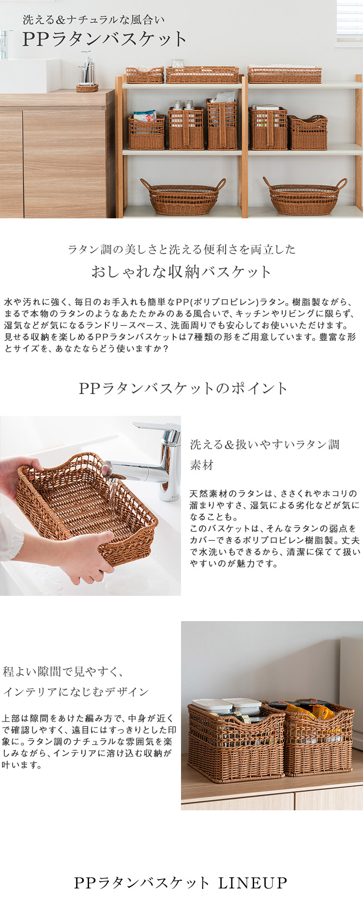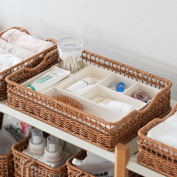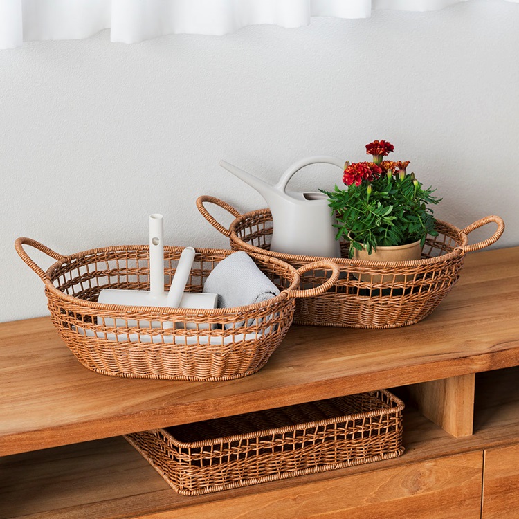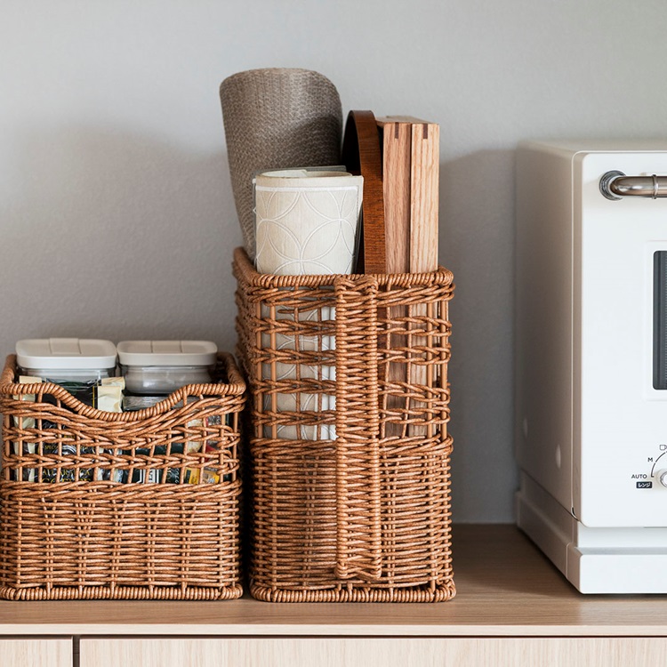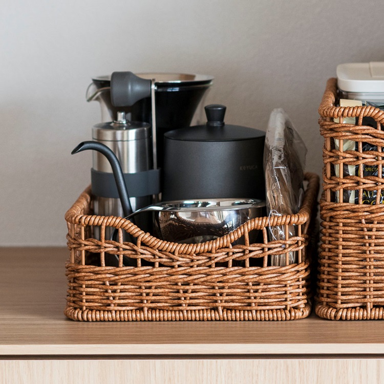 樹脂製ながら、まるで本物のラタンのようなあたたかみのある風合いで、キッチンやリビング、ランドリーなど様々な空間に馴染みます。