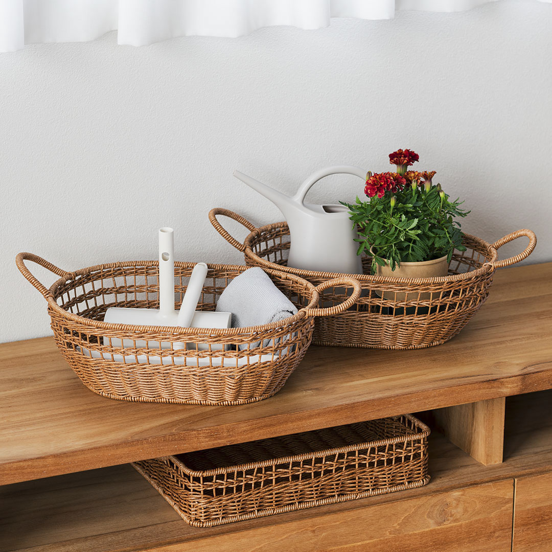 材質はポリプロピレン樹脂でできた人工ラタンで、よごれても水洗いが可能なため、ガーデニングツールや玄関周りのアイテムなど、汚れやすいものをまとめておくのにもおすすめです。