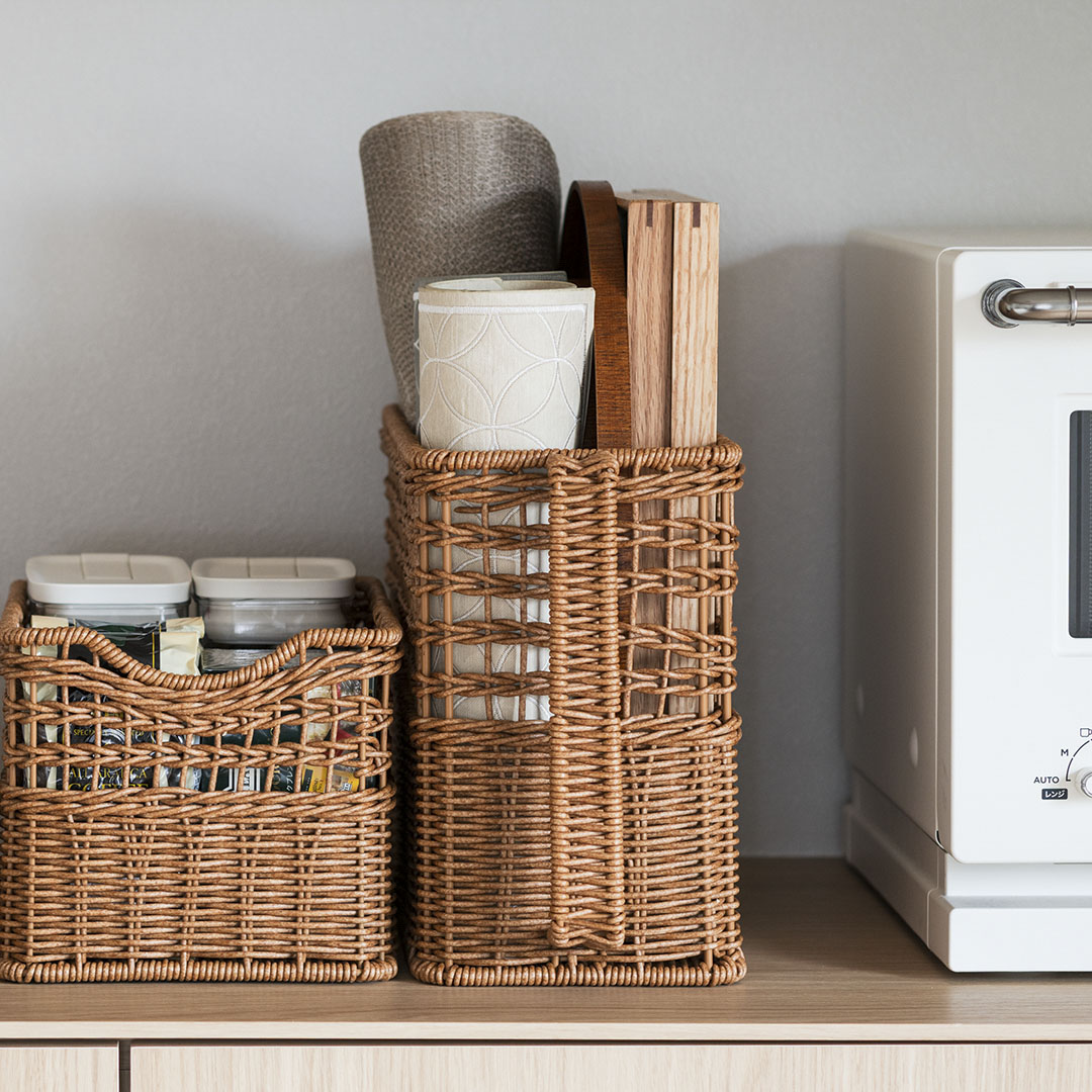 樹脂製ながら、まるで本物のラタンのようなあたたかみのある風合いで、キッチンやリビング、ランドリーなど様々な空間に馴染みます。