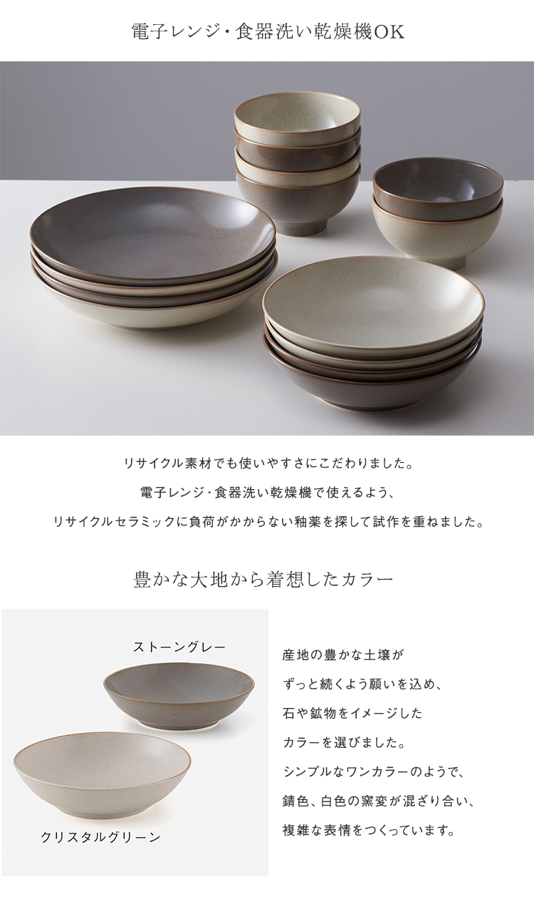 Landリサイクルセラミックシリーズには、岐阜県東濃地方で生産されたリサイクルセラミックが使われています。リサイクルセラミックとは、使用されなくなった食器を細かく粉砕したものを含む陶磁器です。