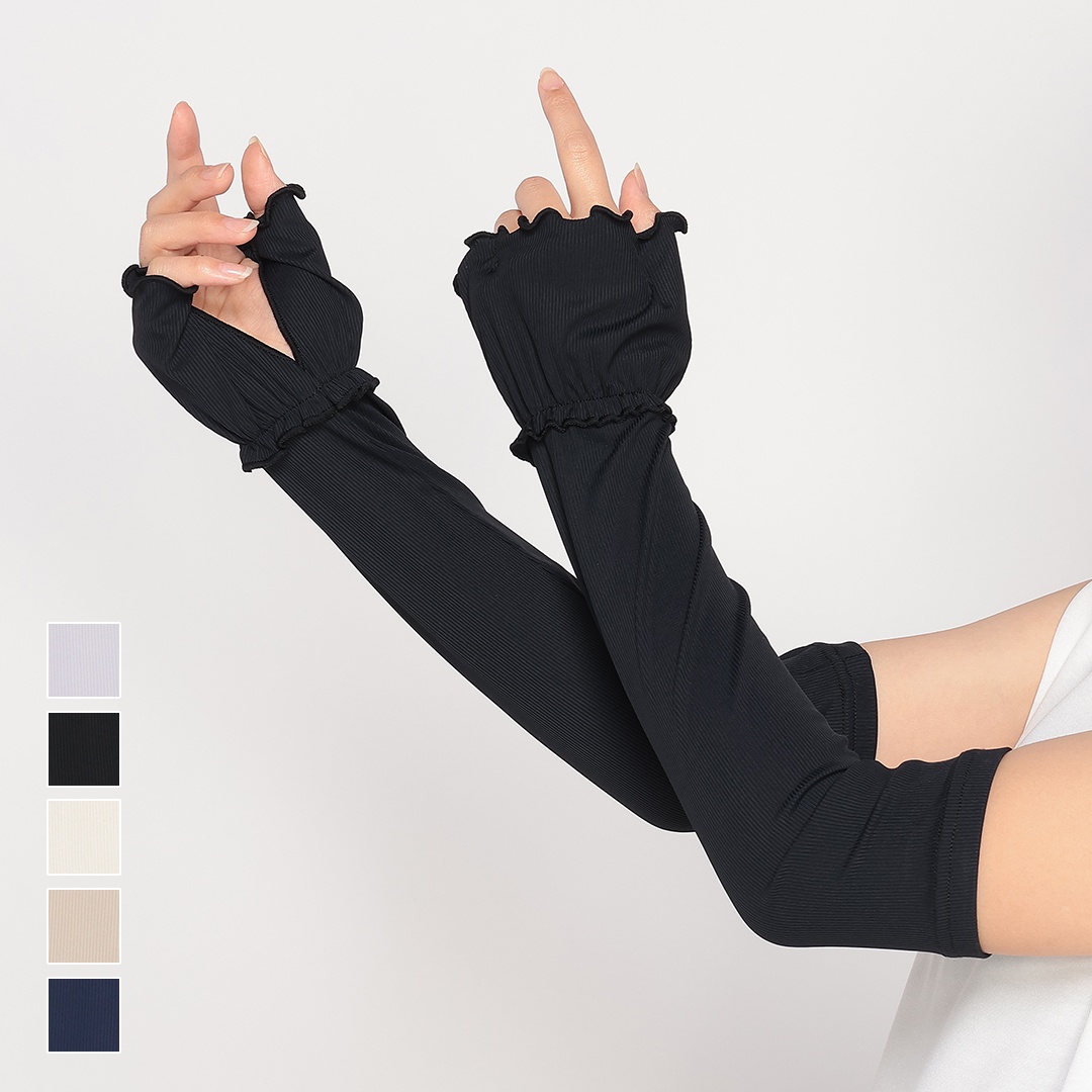 リブ素材で重ね着のように洋服に合わせやすいアームカバーです。手のひらのV字切込みでより涼しく感じます。
