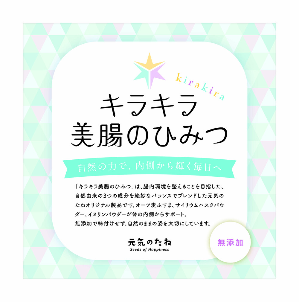 ■キラキラ美腸のひみつ 自然の力で、内側から輝く毎日へ「キラキラ美腸のひみつ」は、腸内環境を整えることを目指した、自然由来の3つの成分を絶妙なバランスでブレンドした元気のたねオリジナル製品です。オーツ麦ふすま、サイリウムハスクパウダー、イヌリンパウダーが、毎日を内側からサポートします。この製品は無添加で、ビタミン剤や味付けを一切行わず、自然のままの姿を大切にしています。