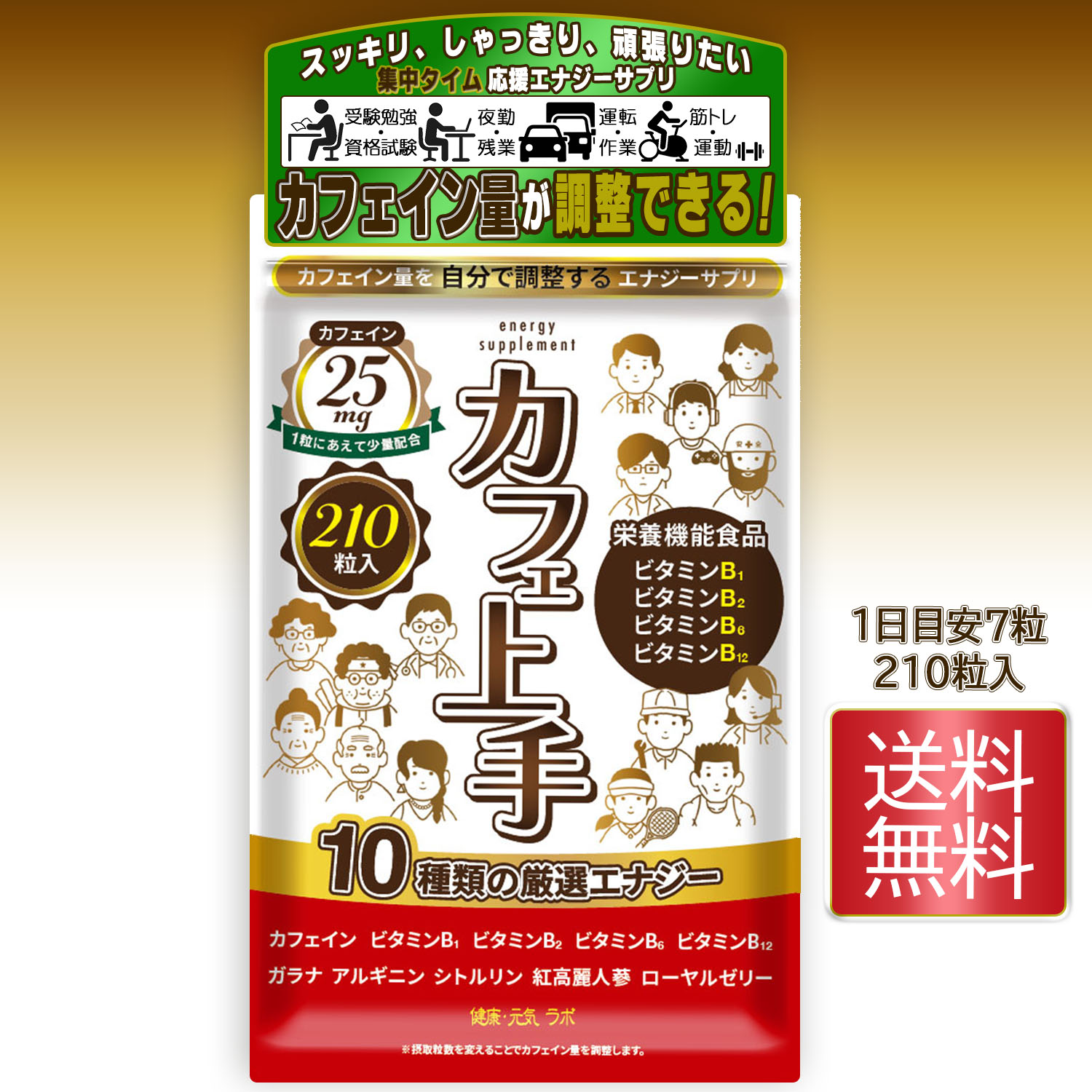 カフェイン サプリ 錠剤 小粒 栄養機能食品 ビタミンB群 天然タウリン ガラナ アルギニン シトルリン 高麗人参 ローヤルゼリー 日本製 送料無料 カフェ上手
