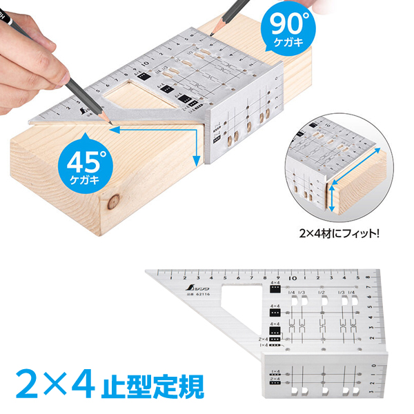 ●2×4材の巾や厚みに合わせたサイズで、簡単にケガキ作業ができます。
