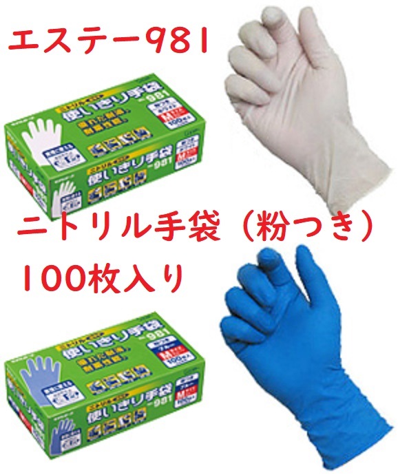 ニトリル使いきり手袋(粉つき) 100枚入り ブルー ホワイト 981 SS、S、M、L 、LL 1箱 エステー モデルローブ 食品加工 機械油作業 介護