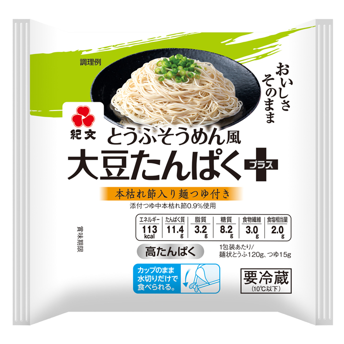 | ■栄養成分 | 1包装あたり ◎1包装あたり(麺状とうふ、つゆ含む) エネルギー:113kcal、たんぱく質:11.4g、脂質:3.2g、炭水化物:11.2g(糖質:8.2g、食物繊維:3.0g)、食塩相当量:2.0g ◎麺状とうふ(120g)あたり エネルギー:93kcal、たんぱく質:10.7g、脂質:3.2g、炭水化物:7.0g(糖質:4.0g、食物繊維:2.9g)、食塩相当量:0.009g サンプル品分析による推定値 |