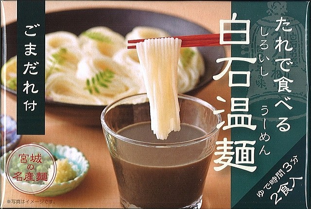 白石温麺(うーめん)を気軽にお好みのたれで食べるごまだれ付き版。甘めの特製の黒ごまだれ(希釈用)が、麺の美味しさをより一層引き出します。“つりがね白石温麺”使用。宮城のお土産・景品等のご利用も多い商品です。