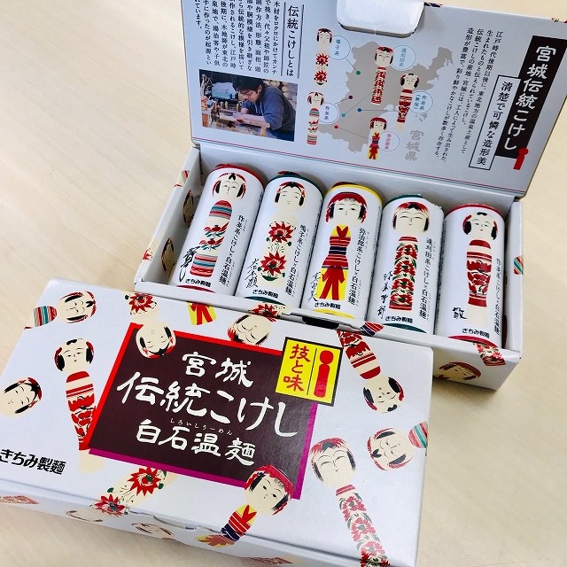 宮城の代表的な伝統こけしの産地、鳴子、遠刈田、作並、弥治郎、各系統のこけしを投映した巻紙を白石温麺のパッケージにしました。外箱にも各こけしをちりばめ賑やかなデザインに。食用油を使用しないで作る製法と9センチの短さが特徴で知られる宮城の名産麺・白石温麺を、こけしのデザインとともにお楽しみいただけます。