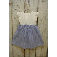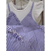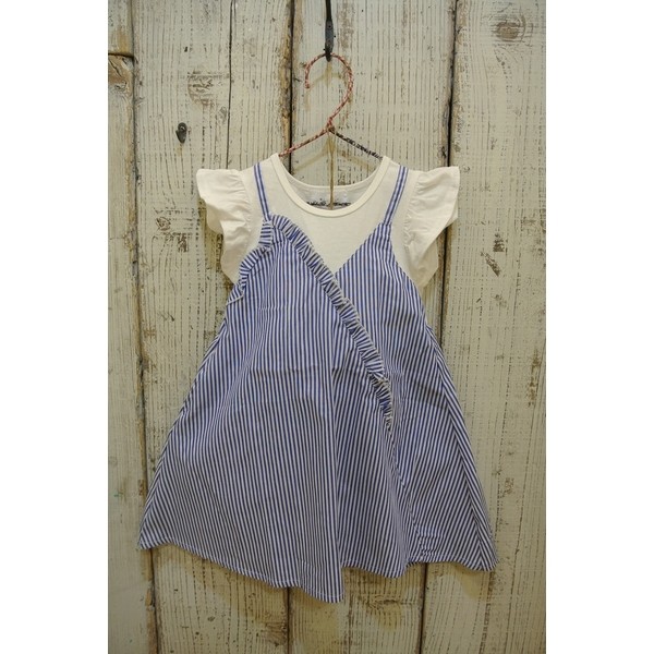 No:N40352色:オフ×ブルー素材:本体綿100%天竺&布帛仕様:柔らかく伸縮性に富んだ天竺フレンチフリルTシャツをベースに、爽やかでストライプな印象のコードレーンの肩架けカシュクールをレイヤード風に切替の腰にワンポケットのデザインワンピース。企画サイズ:80cm〜130cm