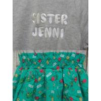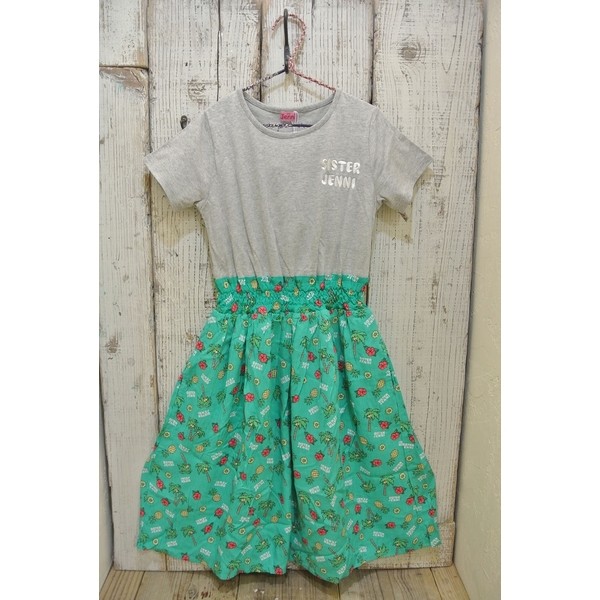 No:097240色:杢グレー×グリーン素材:本体綿100%仕様:柔らかく着心地の良い杢天竺カットソーの半袖Tシャツに胸刺繍、ギャザーの掛かったウエスト下をアロハなスカートセットアップ風切替ワンピース。企画サイズ:100cm〜160cm
