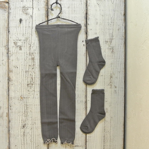 No:S424041色:チャコール素材:綿78%ポリ22%リブニット仕様:コットンをベースにポリで混紡した伸縮自在なソックス編リブニット、縦ジャガード織柄に裾をヤンワリメローで絞ったレギンスにソックスを組合せたノビノビレギンス&ソックス。企画サイズ:80-90cm,90-100cm,100-110cm,110-120cm,130-140cm
