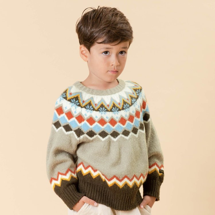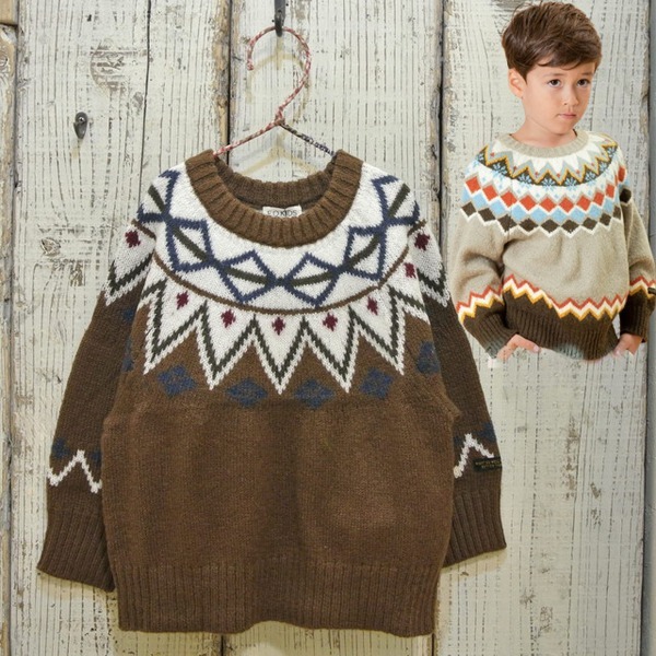 No:R413031色:ブラウン×オフ×ブルー素材:本体 アクリル70%ポリ30%ウォッシャブルリブニット仕様:ノルディックな印象のフェアアイル調ヨークジャガード、密度が高くハイゲージニットセーター。ただニットって洗濯が?!この素材他の物と洗濯機に掘り込めます。企画サイズ:80cm〜140cm