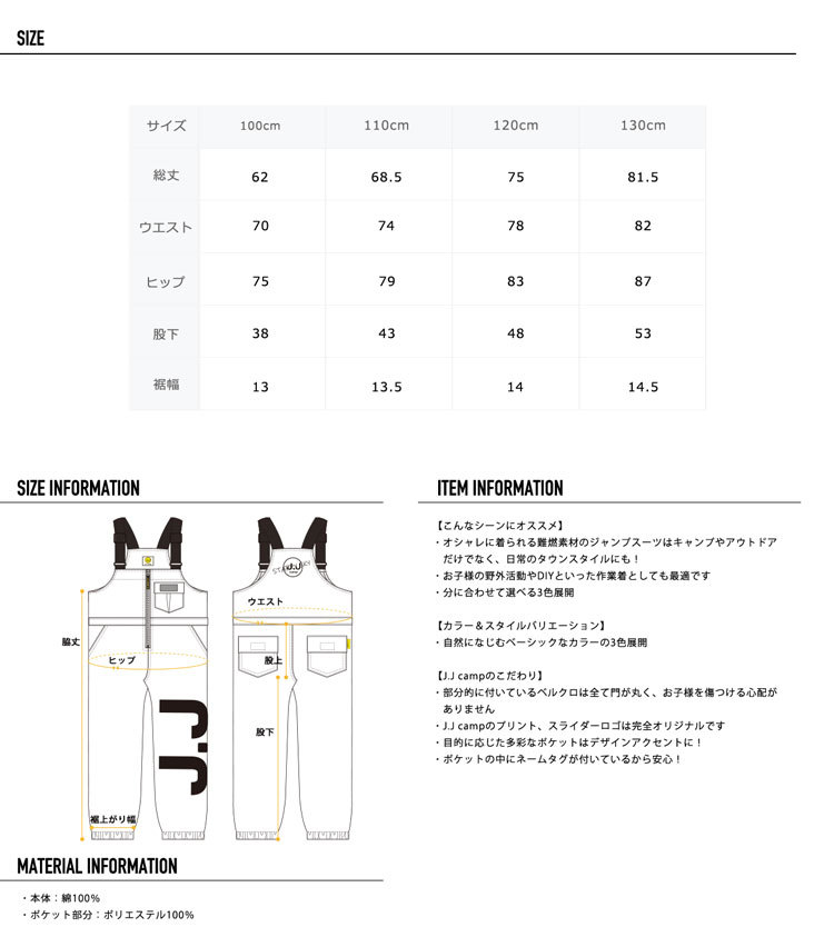 | 特徴 | ・大きな「J.J」のロゴはインパクト抜群! ・難燃素材アイテムにお子様用が登場。親子でキャンプもBBQも思いっきり楽しめます。 ・難燃素材だから大切なお体を火の粉から守ってくれ、お子様も活動的になれます! ・サスペンダーでサイズ調節機能や丈が長めの設定の為、長期間ご使用できます。