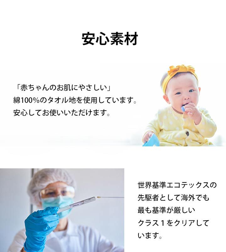 ・世界基準エコテックスの先駆者として海外でも最も基準が厳しいクラス1をクリアした「赤ちゃんが口に含んでも安全」なタオル地を使用。