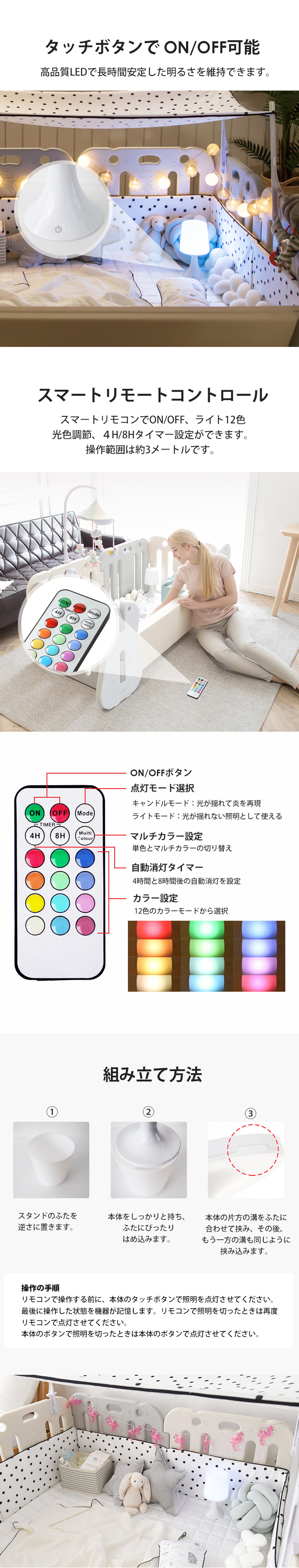 | 注意点 | ◆ご購入前 ・サイズ表をお確かめの上ご購入ください。 ・ご利用のデバイスやPCモニターのカラー設定等により若干異なった色に見える場合がございますが、何卒ご了承ください(赤が青に見える等、明らかに色が異なっていた場合は返品交換の対象となります)。 ◆ご購入後 ・商品が届きましたら、お早めに商品カラー等のご確認をお願いいたします。 ・商品到着後、1週間を過ぎたご返品は基本的にお受けできません。 ◆ご使用時の注意事項 ・単3電池を3本使用します。別途ご用意ください。 ・新しい電池と古い電池、種類の違う電池を混ぜて使用しないでください。 ・リモコンは子供の手の届かない場所に保管してください。 ・リモコンの電池はCR2032のボタン電池をご利用ください。 ・乳幼児の誤飲を防ぐため、電池を取り出しにくい設計となっています。 ・水回りや雨天時の野外でのご利用は故障の原因や感電の危険があるためお控え下さい。 ・タッチボタンやリモコンで操作を行う際は、2秒程度間隔を空けてください。 ・連続して操作を行うと正常に作動しません。 ・リモコンで操作する前に、本体のタッチボタンで照明を点灯させてください。 ・最後に操作した状態を機器が記憶します。リモコンで照明を切ったときは再度リモコンで点灯させてください。 ・本体のボタンで照明を切ったときは本体のボタンで点灯させてください。 |