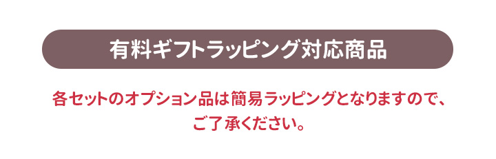 | ご利用のご注意点 | ●通常ラッピングで対応できないサイズの商品専用ラッピングサービスです。 ●ラッピングのみのご注文はできません。 ラッピングのみのご注文はキャンセルとさせていただきます。 ●専用ラッピング対象商品を複数個ご購入の際は、ラッピングが必要な商品と同数のラッピングをカートに入れてください。 ●発送まで1〜4日お日にちを頂戴いたします。 ●包装紙、リボンカラーは当店お任せとなります。 ※包装紙柄、リボンカラーは在庫により変動します。 ●ご注文者様とお届け先様が違う場合、お値段の記載のあるものは同封いたしません ●無料簡易ラッピング、メッセージカードのお取り扱いはございません。 ●熨斗をご希望の場合は備考欄に表書き、送り主名をお知らせください。 ※熨斗は短冊形にて承らせていただきます。 |