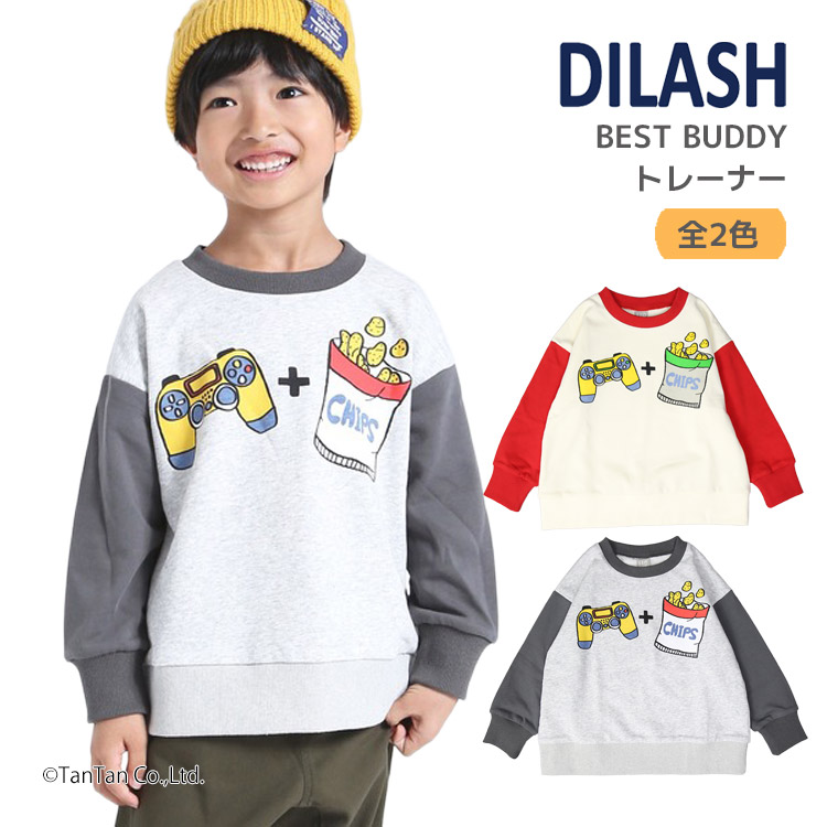 遊び心満点!「ゲームコントローラー+ポテトチップス」=「BEST BUDDY」という楽しいメッセージが前後にデザインされたキッズ用トレーナー。