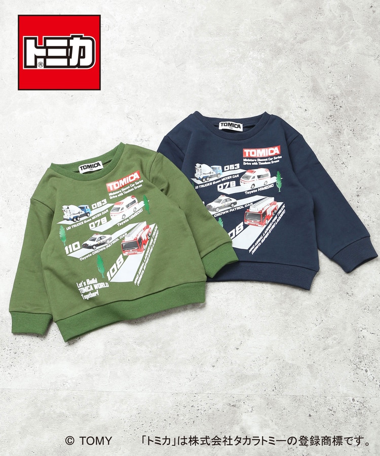 トップス トレーナー スエット スウェット 働く車 人気車両 TOMICA トミカ ロングスリーブ 長袖 裏毛 ロゴ カジュアル お洒落 オシャレ かっこいい かわいい 可愛い 普段着 デイリーウェア お出かけ着 お外着 お外遊び着 子ども服 こども服 男児 男の子 ボーイズ キッズ ベビーサイズ トドラーサイズ 幼稚園 保育園 小学校 通園 通学 小学生 プレゼント ギフト 贈り物 ラッピング DILASH ディラッシュ カーキ ネイビー 紺色