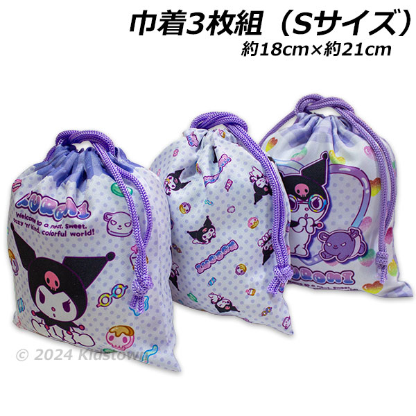 送料無料 クロミ 巾着 3枚組 パープル Sサイズ 約18×21cm ポリエステル100% kuromi 2024年‐2025年版