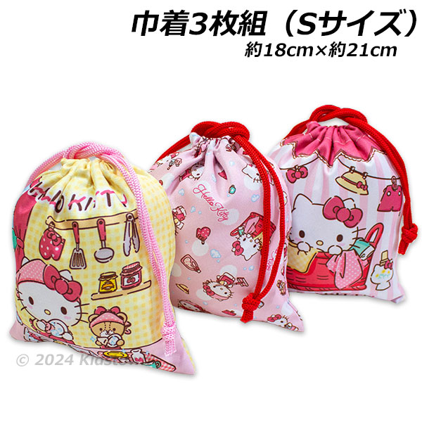 送料無料 ハローキティ 巾着 3枚組 お掃除柄 Sサイズ 約18×21cm ポリエステル100% HELLO KITTY 2024年‐2025年版