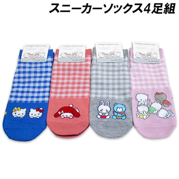 送料無料 サンリオ スニーカーソックス4足組 チェック柄 23-25cm 靴下 ソックス キャラクター Sanrio 2026年
