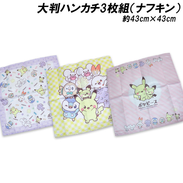 送料無料 ポケモン 大判ハンカチ3枚組 ポケピース柄(ナフキン)ポリエステル100% 約43×43cm ランチ ランチクロス ポケットモンスター 2025年