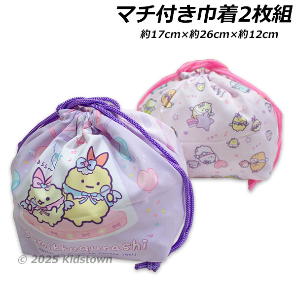 送料無料 すみっコぐらし マチ付き巾着2枚組 天使なえびてんアイドル柄 約17cm×約26cm×約12cm 巾着 ランチ巾着 きんちゃく 袋 2025年