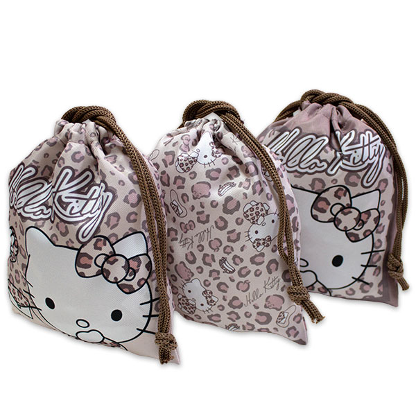送料無料 ハローキティ 巾着 3枚組 豹柄 Sサイズ 約18×21cm ポリエステル100% HELLO KITTY 2025-2026年
