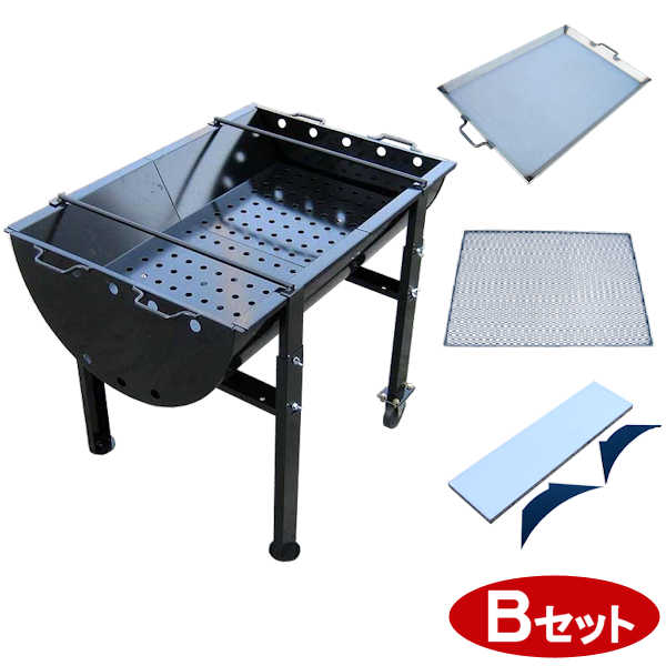 セット 内容 | ● BBQコンロ 900型 ● 鉄板(中) ● エキスパンド焼きアミ(中) ● ステンレス補助棚 |