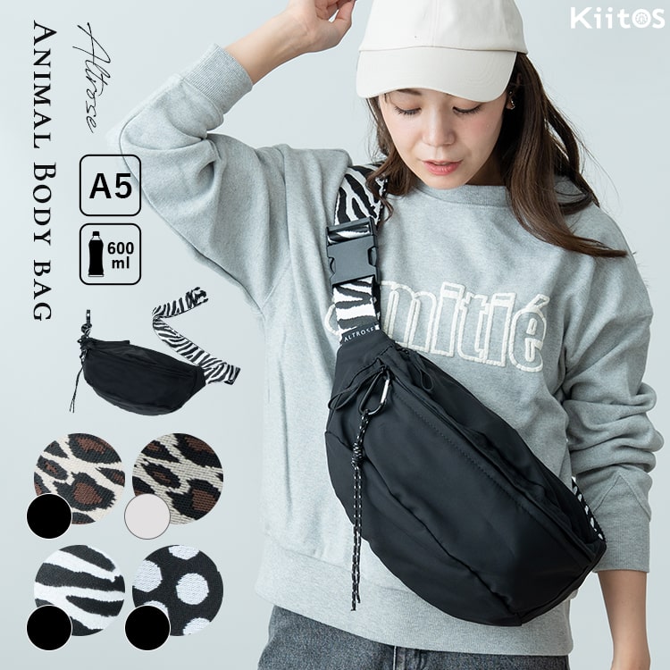 肩元にアクセントを添える、アニマル柄ショルダーストラップが印象的なボディバッグ。