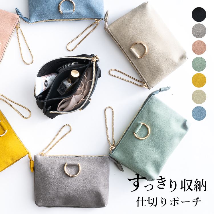 キラッと光るリングモチーフが魅力的な3層仕切りポーチ。