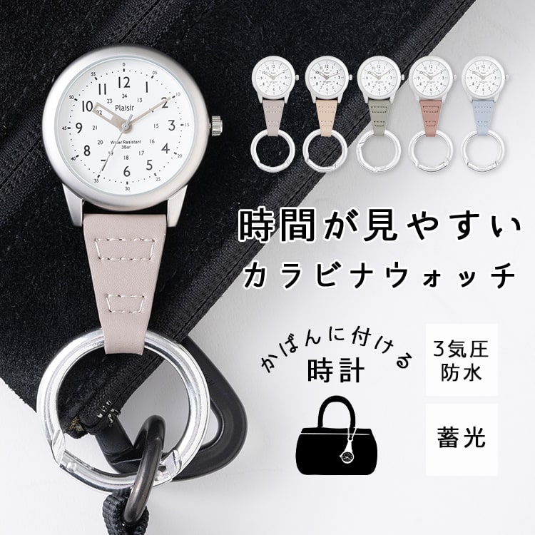 カラビナがストッパーになり文字盤が固定されるので、置いても時間が見やすい仕様です。