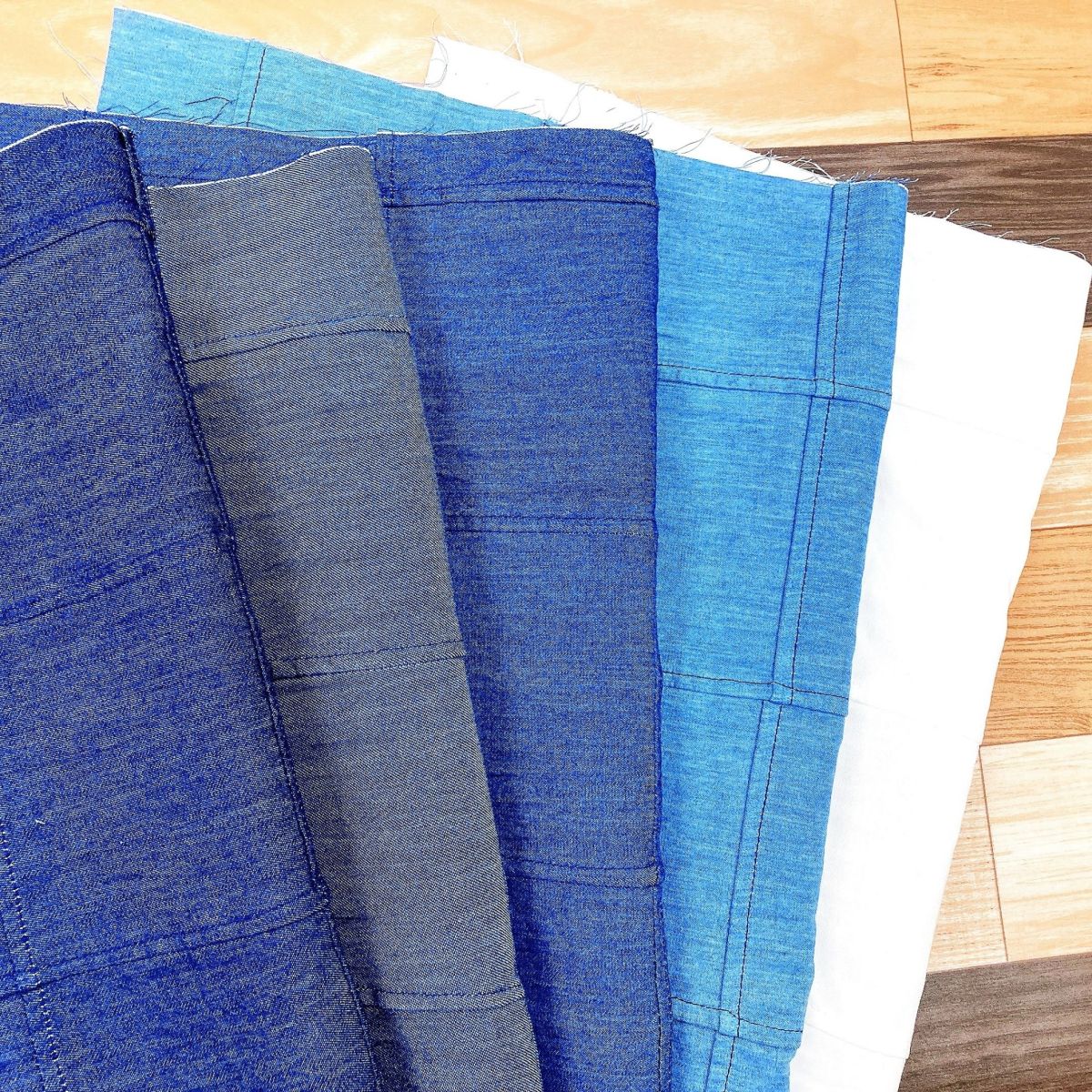 インディゴデニムを縫い合わて生地に仕上げました。