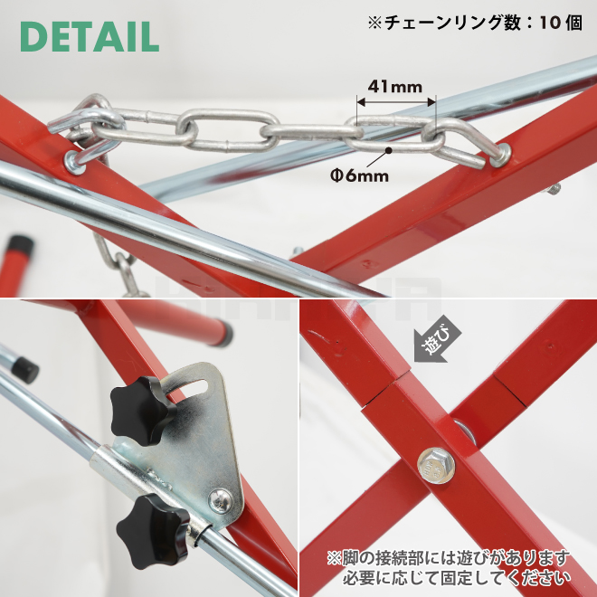 ※脚の接続部には製造上、遊びを設けております 設置の際に不安定な場合は、必要に応じて固定してご使用ください ※高さと幅のサイズはフックの角度で変わることがあります ※チェーンは7個目まででご使用ください ※傾斜のない平らな場所でお使いください ★その他塗装ラック、スタンドの取り扱いもございます ![]() |