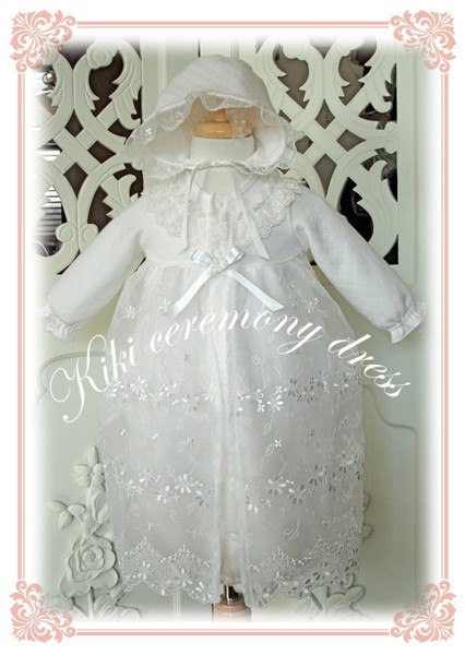 退院、お宮参りなどのお披露目に最適なセレモニーコンビドレス、フードと2点セットです!