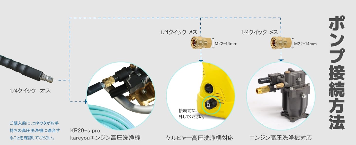 『簡単な接続』この延長ホースはさまざまなモデルの高圧洗浄機に取り付けるために設計されており、1/4インチのクイックコネクトソケットと1/4インチのステンレススチールプラグが装備されており、安全に接続できます。