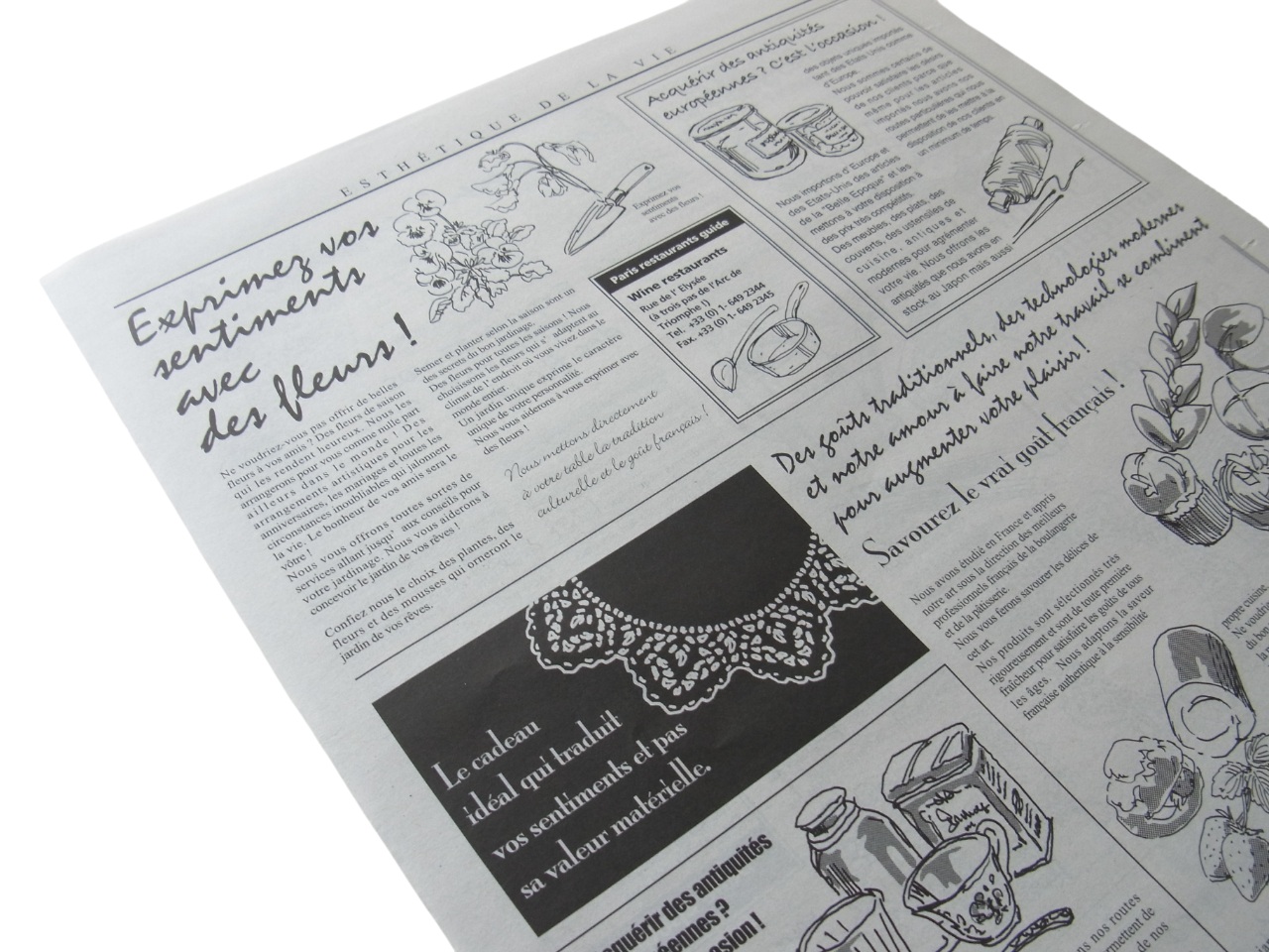英字新聞風デザインの包装紙です。本物の新聞紙に使われる紙へ印刷しており、リアルな新聞紙を再現しています。