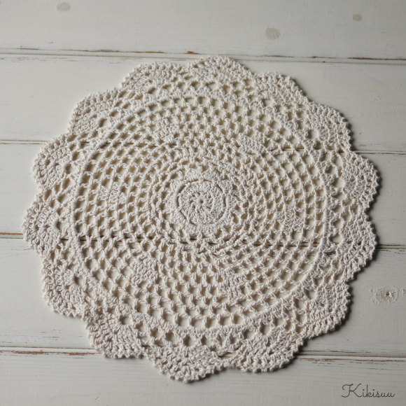 円形のレースドイリーです。手編みのある編み模様が、