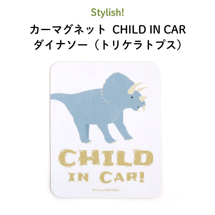 かっこいいトリケラトプスのイラストが魅力のカーマグネットです♪シンプルなデザインにホワイトベースのカラーなので、車体を選ばず使いやすい◎カーマグネットは後続車に安全運転やお子さまが乗っていることを伝えるだけでなく、万が一の事故の際に小さなお子さまが乗っていることを車外に知らせ、一刻も早い救助を必要とするサインにもなります。お子さまを乗せる際の安心として、付けておきたいアイテムです。