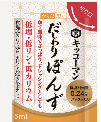 個包装なので場所を選ばず塩分調節できる新しい減塩生活。低塩、低リン、低カリウム。普通のぽんずの塩分をさらに少なくし、使い勝手の良い味に仕上げました。酸味とゆずの香りにより、さっぱりとおいしく、ドレッシングとしてもお召し上がりいただけます。