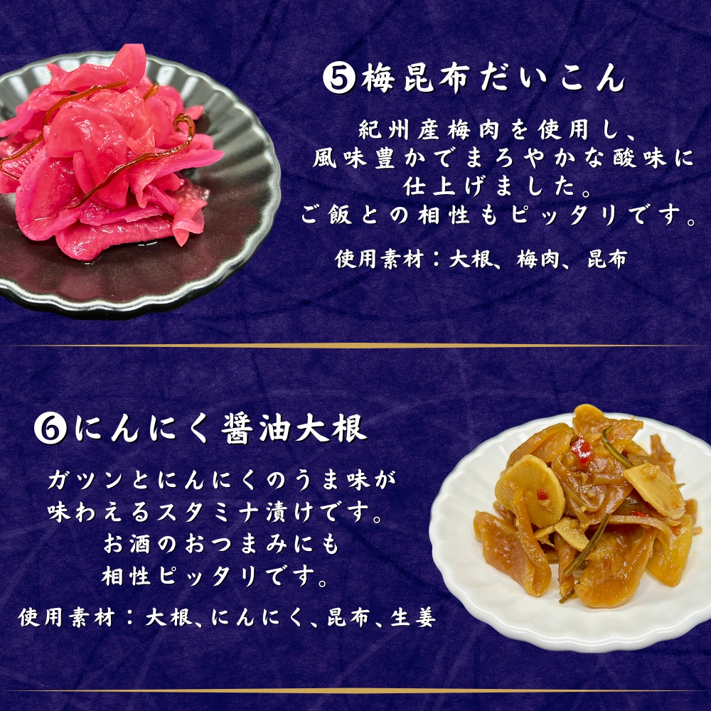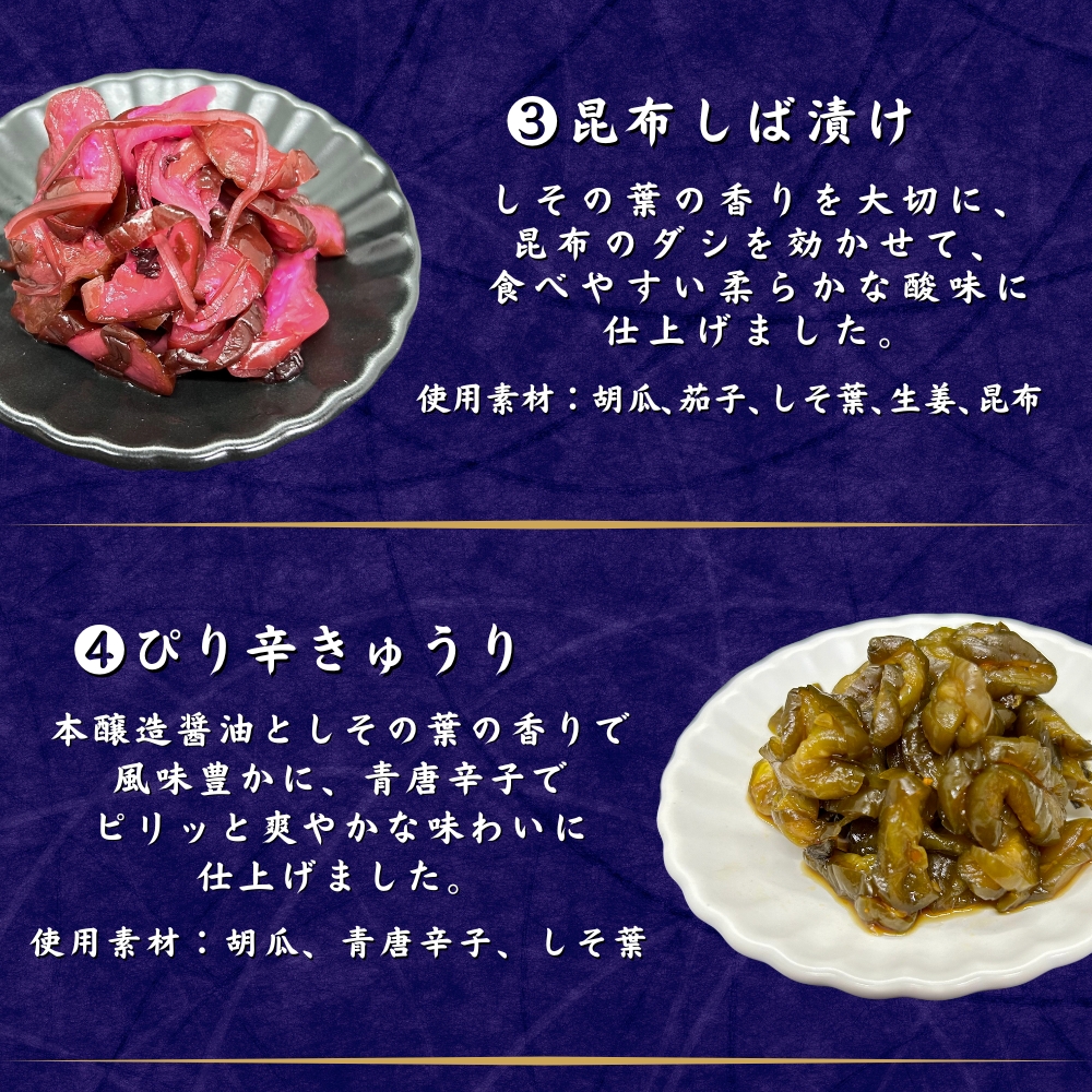 | 賞味期限 | 【さっぱり醤油漬け】製造から120日 【コクみそ醤油漬け】製造から120日 【ぴり辛きゅうり】製造から180日 【昆布しば漬け】製造から120日 【梅昆布だいこん】製造から120日 【にんにく醤油だいこん】製造から120日 |