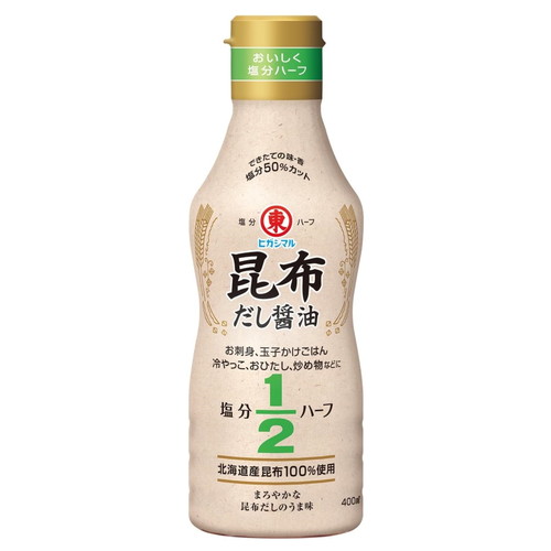 ・普通の濃口醤油に比べて塩分を50%カットしているので、健康志向の方にもおいしく、安心してお使いいただけます。