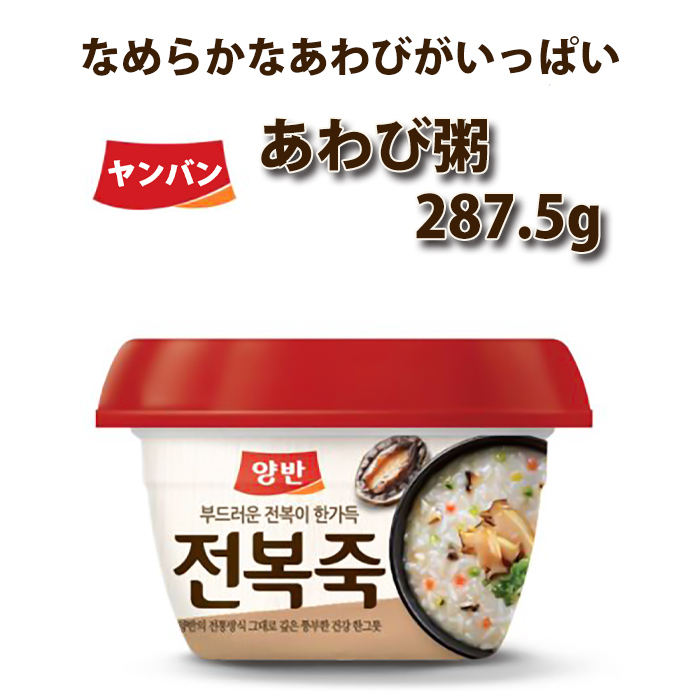 粥:アワビ5.8%(フィリピン産)、もち米(韓国産)、ニンジン2.7%(韓国産)、貝野菜エキス、野菜エキス、シイタケ、ごま油スープ:ノリ50%(韓国産)、ごま50%(輸入品)ごま油:ごま100%(輸入品)