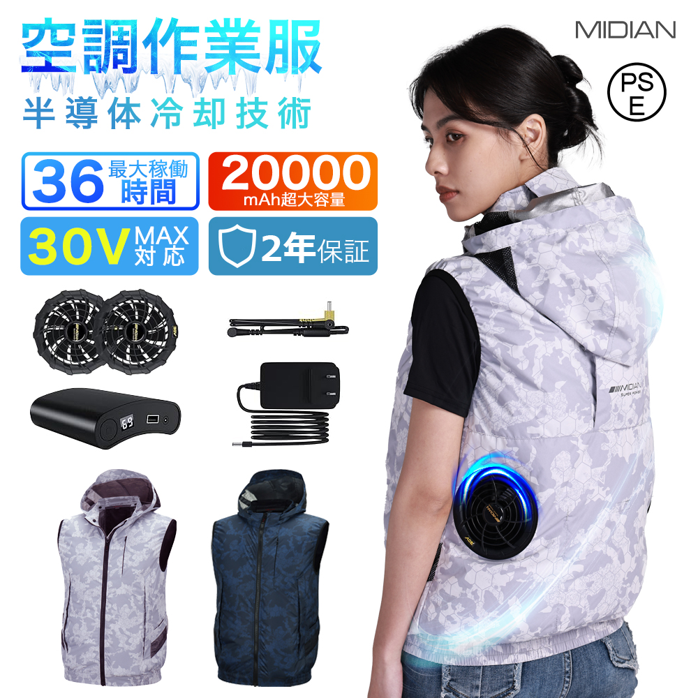 MIDIAN 空調作業服 17V/24V/30V ファン付き作業服 ベスト ファン 20000mAh バッテリー セット 現場工事 熱中症対策 釣り ゴルフ 猛暑対策 作業着 夏用防暑服
