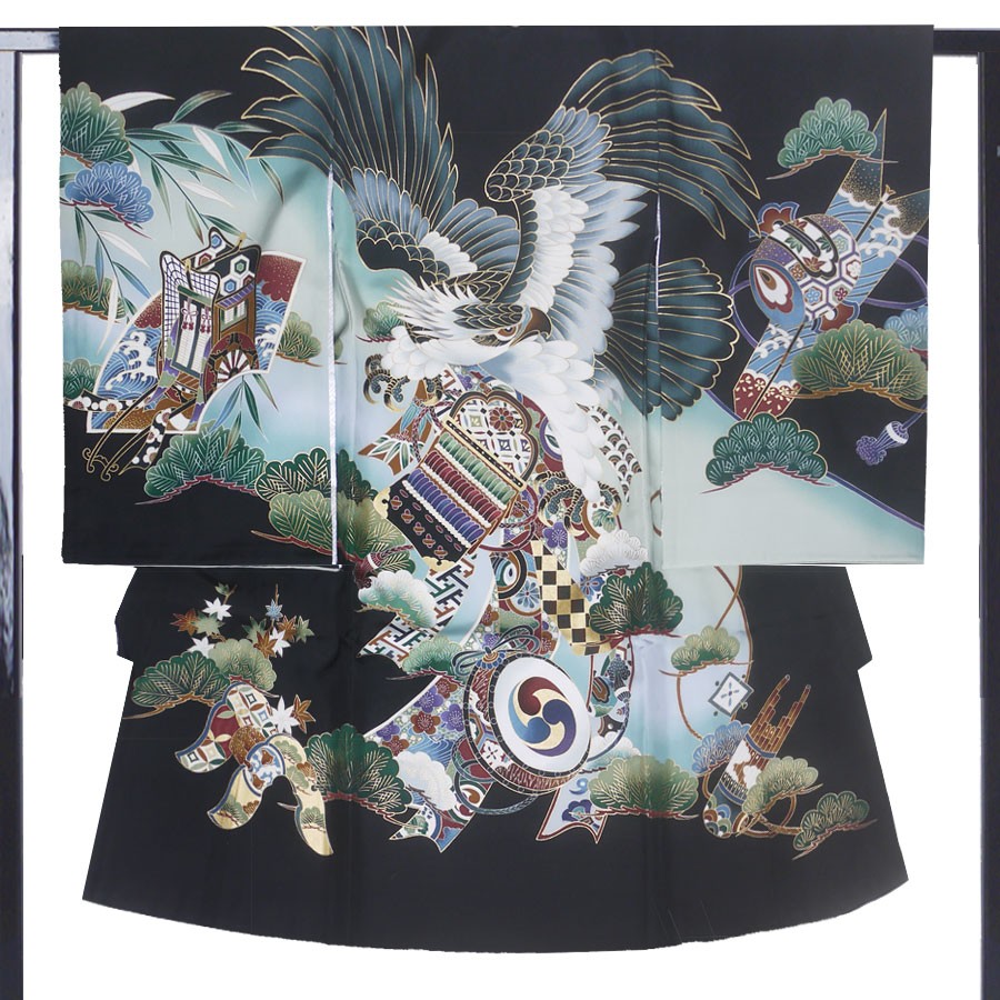 男児 熨斗目 レンタル商品 お宮参り 着物 帽子 よだれかけ セット 貸衣装 和服 祝い着 初着 産着 往復送料無料 黒 鷹