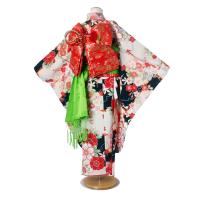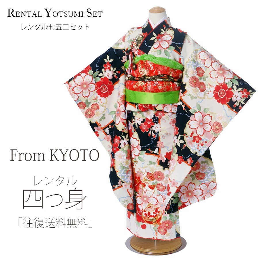 From KYOTO レンタル商品 7歳の七五三 女の子 四つ身 着物 帯 フルセット 貸衣装 七歳 黒 桜 梅 刺繍